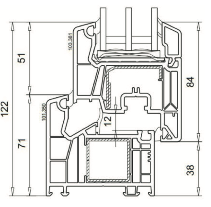 - Ansichtsbreite Rahmen/Flügel: 122 mm